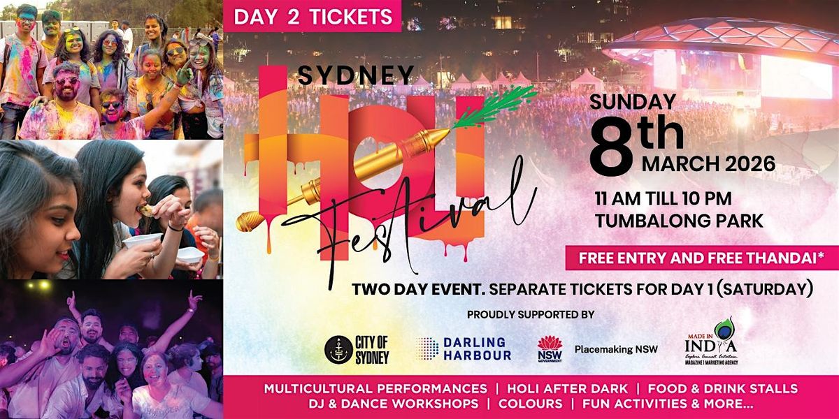 * * This listing is for securing your DAY 2 Tickets to our TWO-DAY Holi Festival extravaganza on 7th & 8th of March 2026 at the iconic Tumbalong Park.