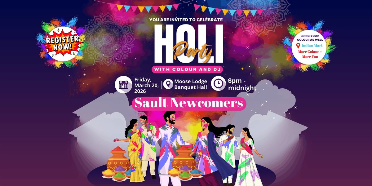Celebrate Holi on March 20 with Sault Newcomers! Colors, music, & fun. Wear white and join the vibrant community celebration! ✨