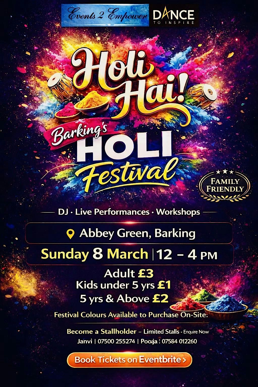 Get ready to celebrate the vibrant and joyous festival of Holi at the beautiful Abbey Ruins Park in East London! Join us for a day filled with music, dancing, Food Stalls & varied stalls (available on payment-bring cash/change) and of course, lots of colorful powder( available on payment). Let's come together to spread love and happiness as we welcome the arrival of spring. Don't miss out on this unforgettable experience - mark your calendars now!