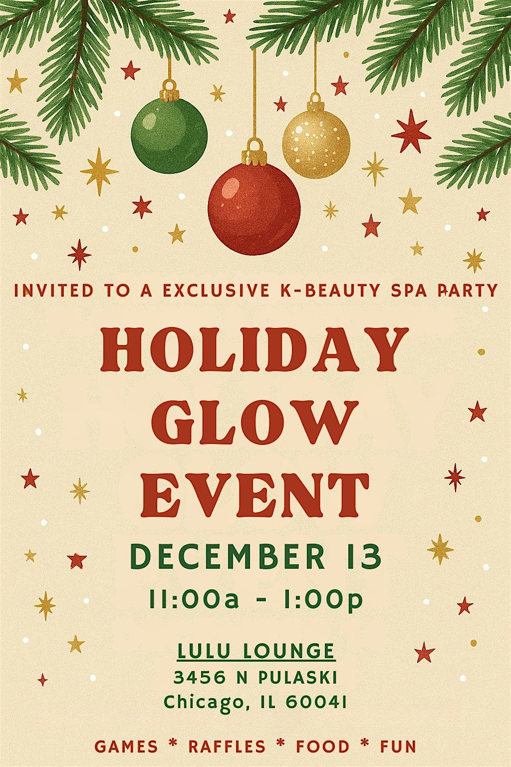 Join us for a festive Holiday Glow Party featuring the #1 Korean skincare! Enjoy games, raffles, music, food, and an exclusive hands-on beauty experience that will leave you glowing for the season. Perfect for skincare lovers, beauty planners, and guests!