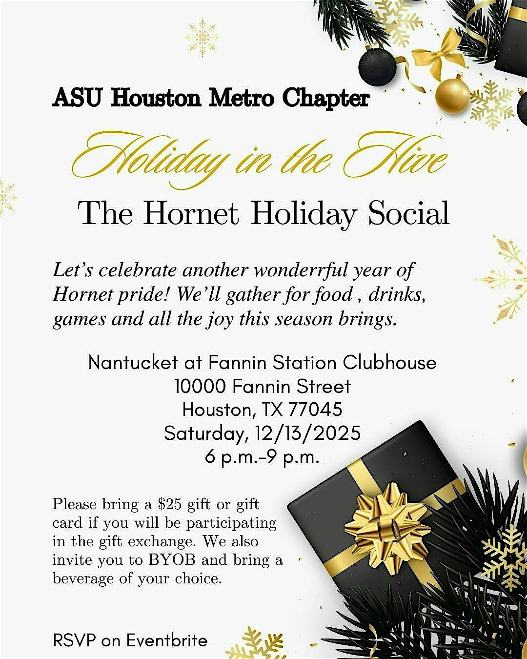 Join us as we celebrate another wonderful year of Hornet pride! The ASU Houston Metro Chapter invites you to an evening filled with food, drinks, games, laughter, and all the joy this holiday season brings.