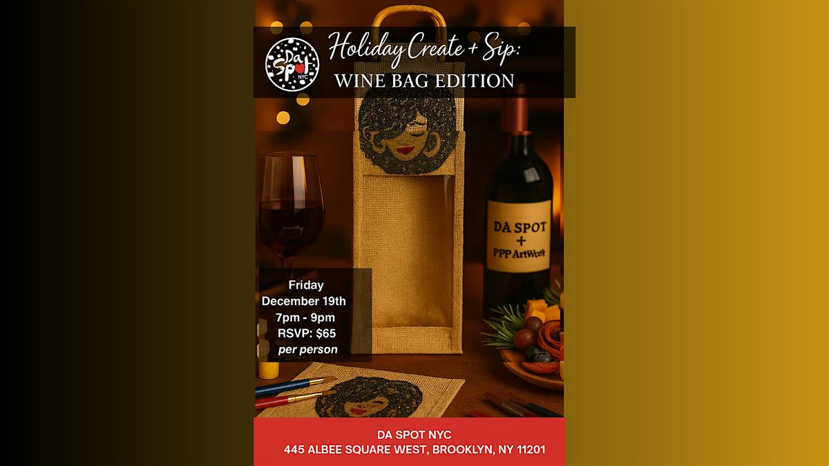 Join us at DA SPOT NYC for a festive Sip & Create night led by Pascale "Diva" Baron, Owner of PPP Artwork! In this fun, hands-on holiday workshop, you’ll design your own artistic wine bag while enjoying two glasses of wine, charcuterie, music, raffles, and cozy creative vibes. No experience needed, just come ready to relax, paint, sip, and take home something beautiful. Perfect for gifting, girls night, date night, or a solo reset during the holiday season.