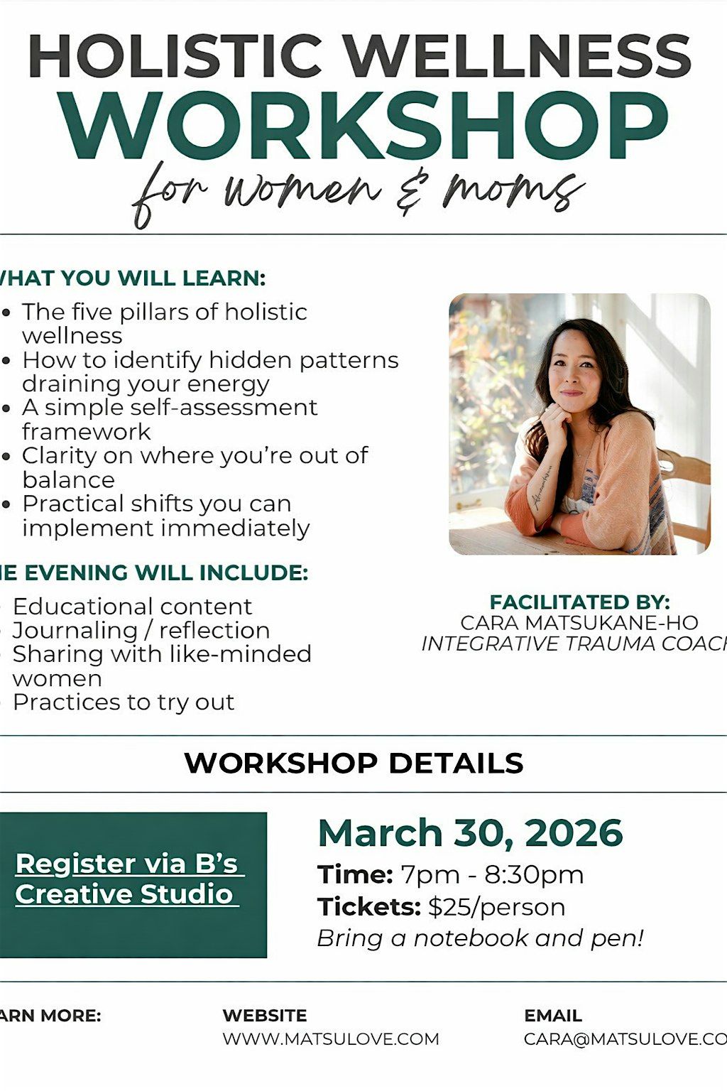 In this 90-minute experience, you’ll learn how the Five Pillars of Holistic Wellness — Mental, Emotional, Physical, Spiritual, and Relational — work together to create lasting balance and joy. We’ll explore how nervous system regulation, invisible labor, hormone rhythms, and relational patterns quietly shape your energy, resilience, and presence .