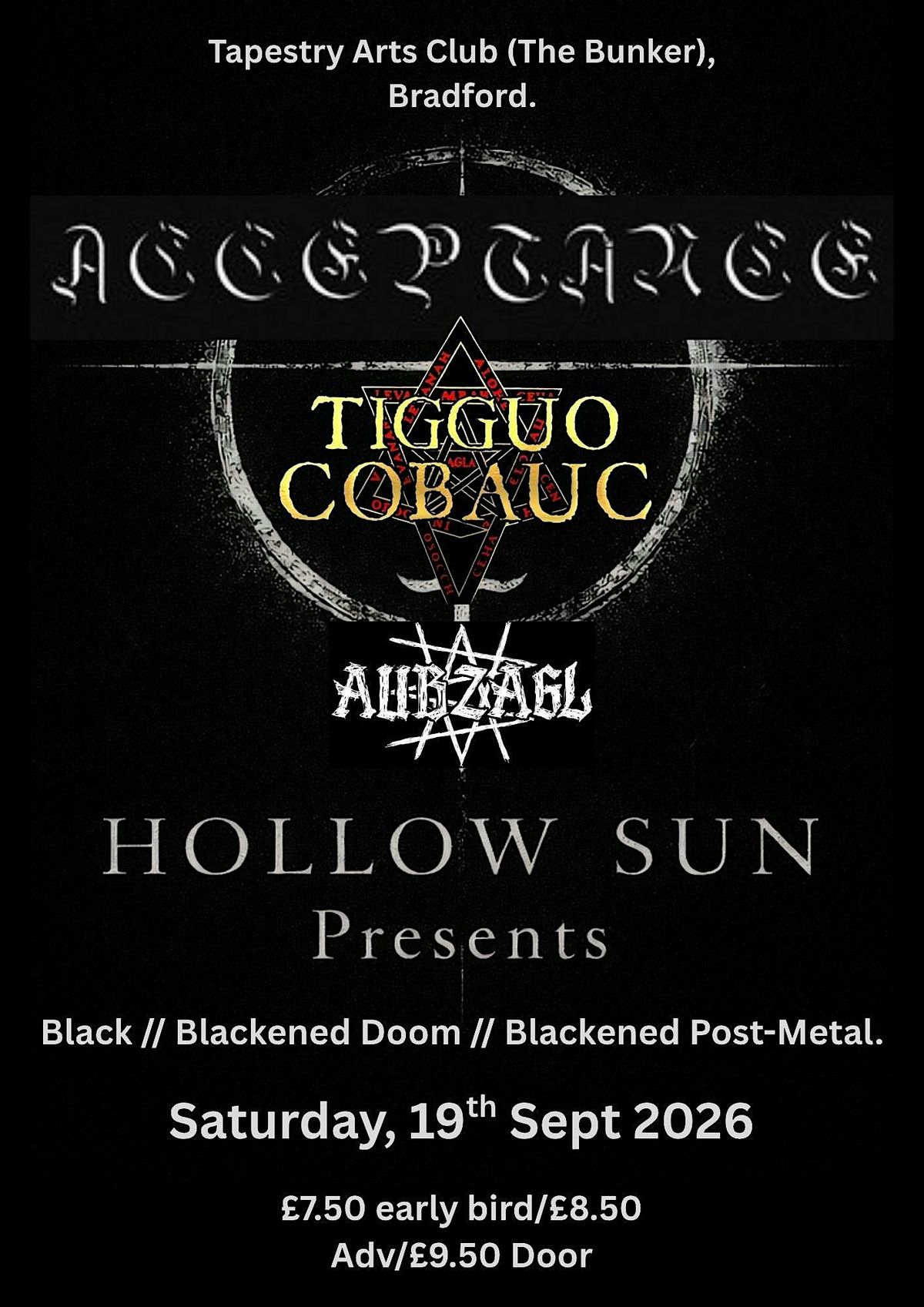 Hollow Sun presents an evening of atmospheric, black, blackened doom and post-metal in the intimate setting of the Tapestry Bunker Room, Bradford.