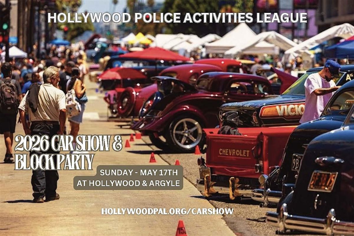 The Hollywood PAL Car Show & Block Party is a free, family-friendly community event featuring over 180 vehicles, live entertainment, food vendors, and activities for all ages.