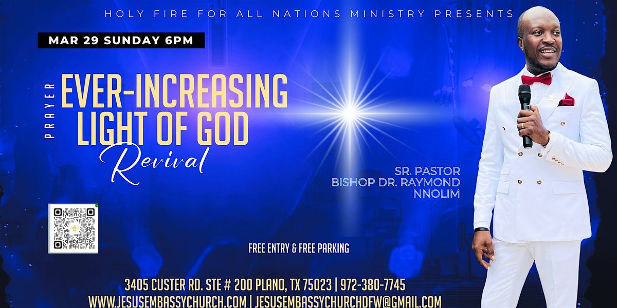 Come and experience the power of the Holy Spirit at Holy Fire For All Nations Ministry, the outreach ministry of Jesus Embassy Church! This in-person event is a time of refreshing and renewal. Join us for uplifting worship, inspiring message from the unadulterated Word of God and life-changing encounters with God. Whether you're seeking a deeper connection with the Holy Spirit or seeking encouragement in your Christian Walk, this revival is for you! Open to all ages, backgrounds, and denominations. Don't miss this opportunity to encounter God's presence in a powerful way. Mark your calendars and invite your friends and family to join us at the Holy Spirit Revival!