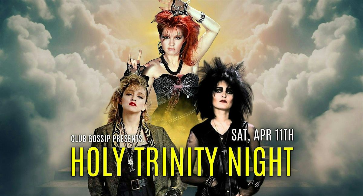 Join us on Holy Trinity night as we celebrate 3 incredible Icons, Cyndi Lauper, Siouxsie and Madonna, who give us music we love and have fundamentally contributed to the music we crave. Let’s get together in two rooms of fun as we play lots of Cyndi Lauper, Siouxsie and the Banshees, Madonna and everything else we love from the 80s — New Wave, Goth & Pop. All the New Order, Kate Bush, The Cramps, Joy Division, Devo, Amiee Mann, Duran Duran, The Smiths, Alison Moyet, Eurythmics, Laura Branigan, The Cure and everyone great from the new wave era.