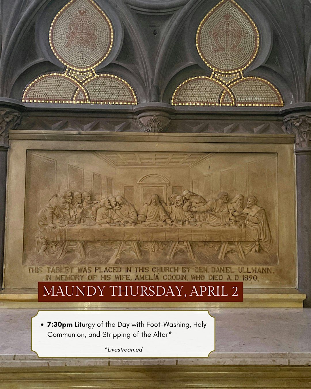 - 7:30pm Liturgy of the Day with Foot-Washing, Holy Communion, and Stripping of the Altar*