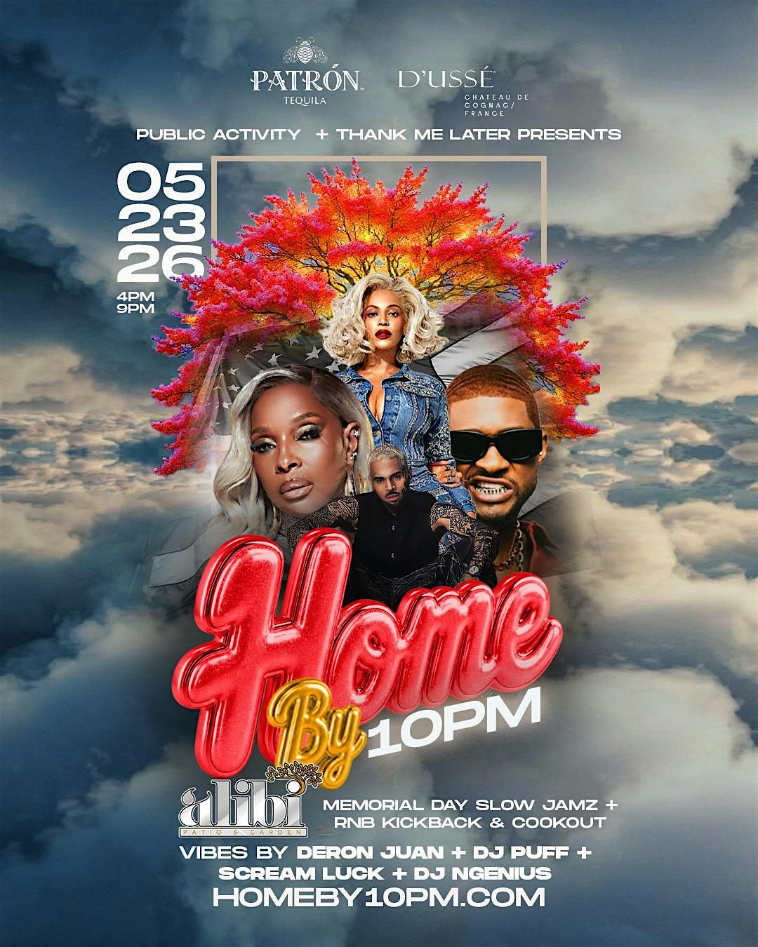 MEMORIAL DAY WEEKEND sponsored by DUSSE + PATRON! HOME BY 10PM at ALIBI. R&B all day, cookout vibes, drinks flowing, grown energy!About this Event