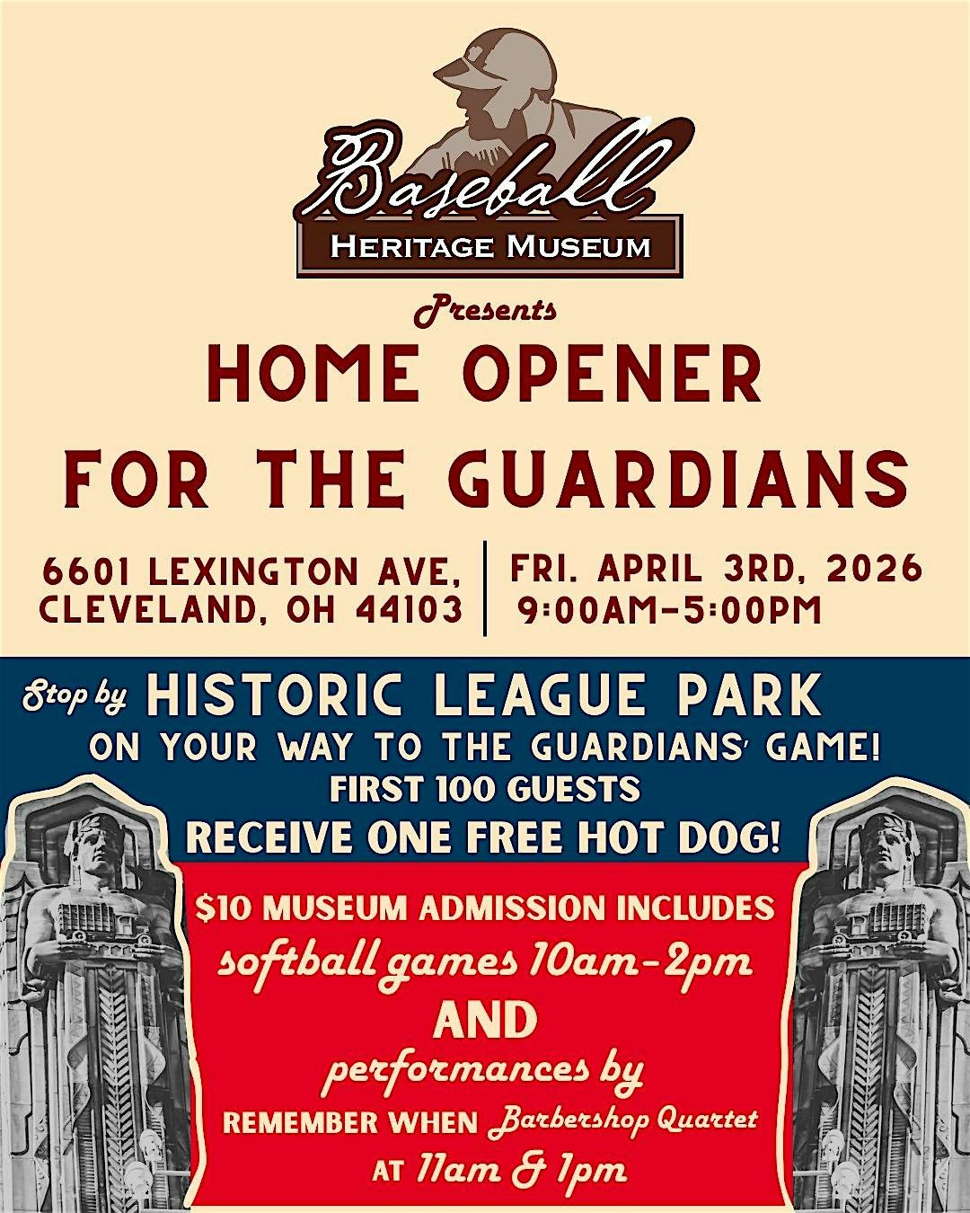 Celebrate Opening Day in true Cleveland style at the Baseball Heritage Museum during our Cleveland Guardians Home Opener celebration on April 3rd! As the city kicks off a new baseball season, join us for a full day of fun featuring live performances by REMEMBER WHEN, a classic barbershop quartet bringing timeless harmony to League Park. Enjoy softball games on the field throughout the day, soak in the historic atmosphere, and don’t forget—the first 100 guests with paid admission receive a free hot dog. It’s a festive, family-friendly way to honor Cleveland’s deep baseball roots and cheer on the Cleveland Guardians as the season begins.