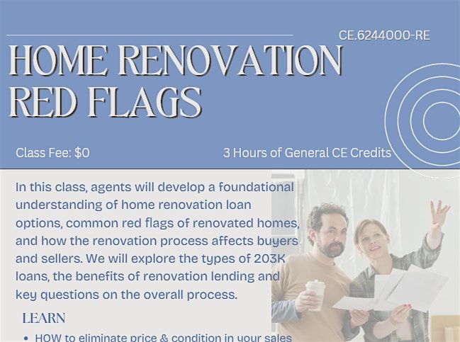 In this class, agents will develop a foundational understanding of home renovation loan options, common red flags of renovated homes, and how the renovation process affects buyers and sellers. We will explore the types of 203K loans, the benefits of renovation lending and key questions on the overall process.