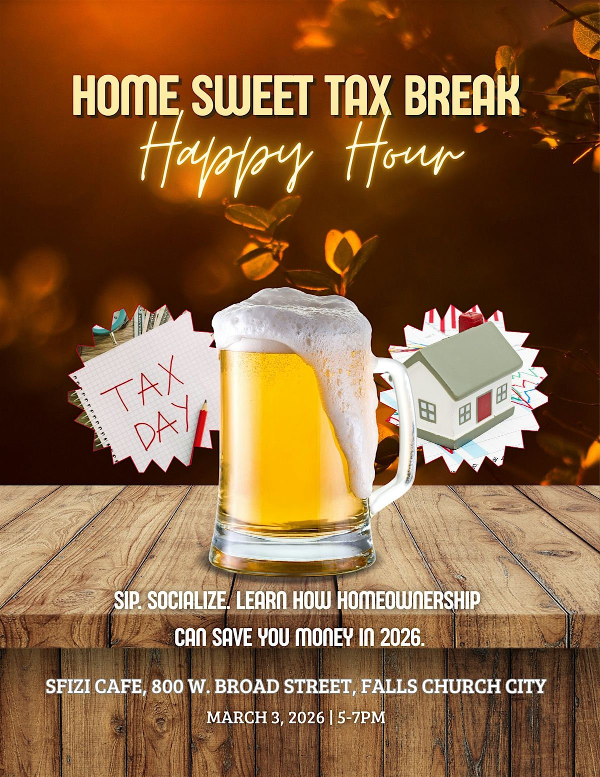 Join us for a casual, social happy hour with a quick, easy look at how homeownership can come with some meaningful tax savings. We’ll touch on how current tax rules may help homeowners keep more of their money—no jargon, no pressure. Just good drinks and apps, good company, and helpful info you can actually use. FREE! Simply register to join.