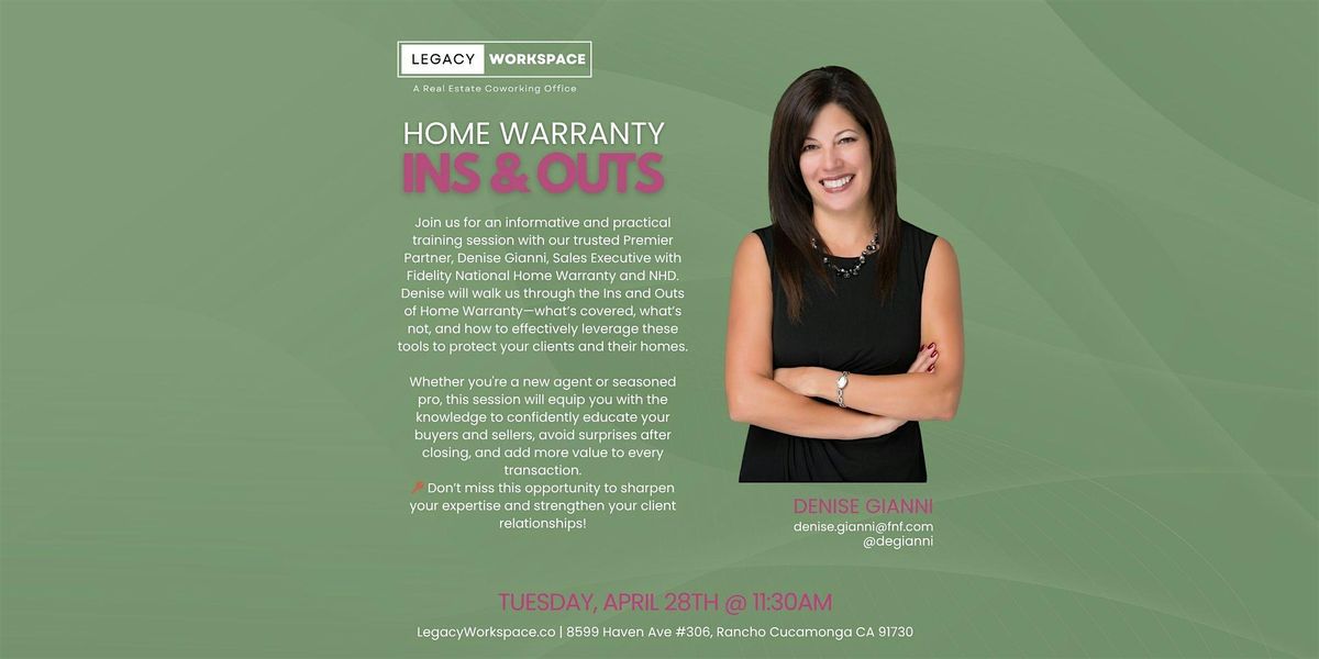 Join us for an informative and practical training session with our trusted Premier Partner, Denise Gianni, Sales Executive with Fidelity National Home Warranty and NHD. Denise will walk us through the Ins and Outs of Home Warranty—what’s covered, what’s not, and how to effectively leverage these tools to protect your clients and their homes.