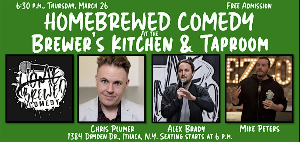 The laughter is coming to Ithaca when Homebrewed Comedy hits the stage at Brewer's Kitchen and Taproom on Thursday, March 26. Chris Plumer is headlining the show and Alex Brady is joining host Mike Peters.
