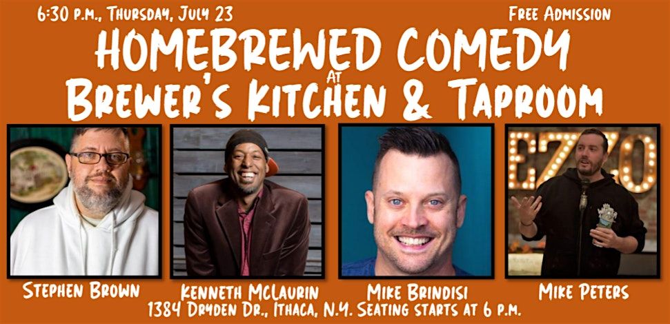 The laughter is coming to Ithaca when Homebrewed Comedy hits the stage at Brewer's Kitchen and Taproom on Thursday, July 23. Kenneth McLaurin is headlining the show and Stephen Brown and Mike Brindisi are joining host Mike Peters.