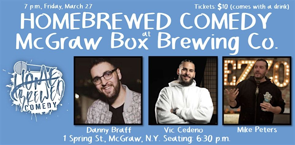 The laughter is coming to McGraw when Homebrewed Comedy hits the stage at McGraw Box Brewing Co. on Friday, March 27. Danny Braff is headlining the show and Vic Cedeno is joining host Mike Peters.