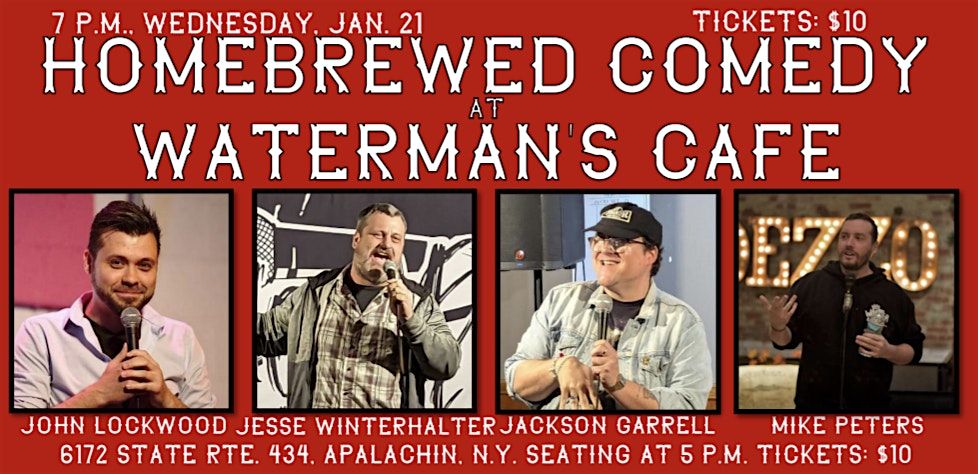 The laughs are coming back to Apalachin when Homebrewed Comedy takes the stage at Waterman's Cafe and Tasting Barn on Wednesday, Jan. 21. Jesse Winterhalter is headlining the show, and he'll be there with John Lockwood, Jackson Garrell and host Mike Peters.