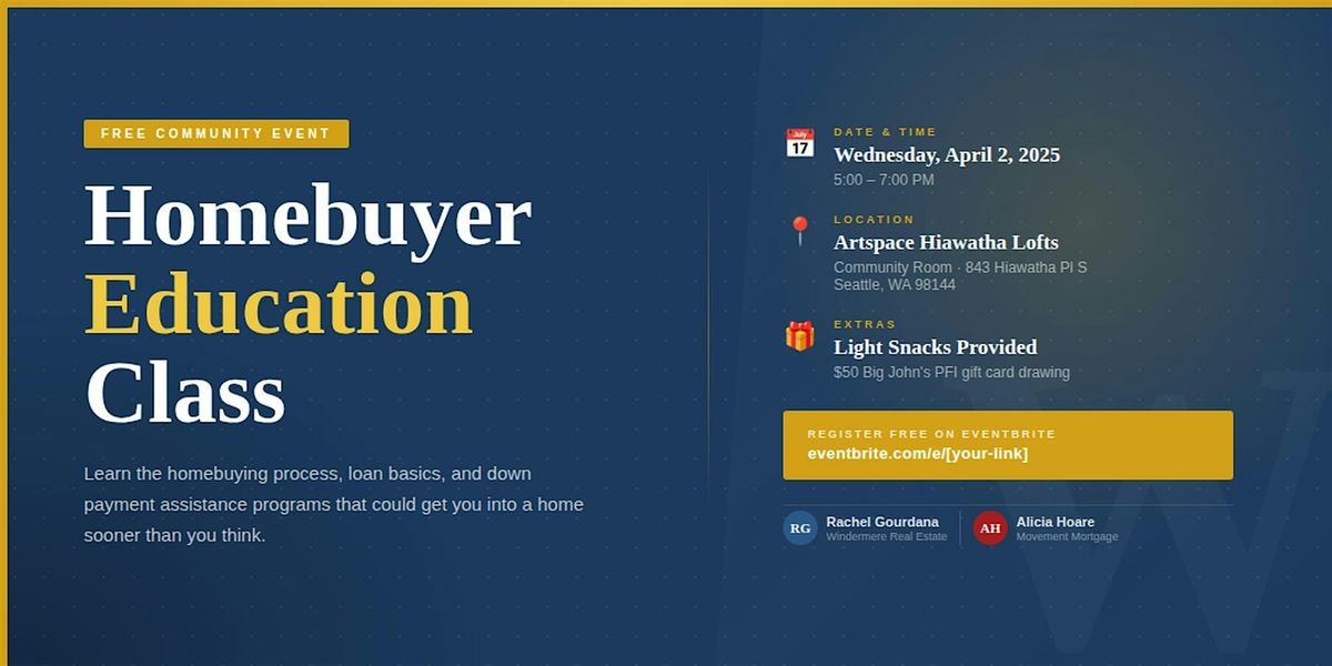 Free homebuyer class! Learn the process, loan basics & down payment assistance. Light snacks + $50 gift card drawing.