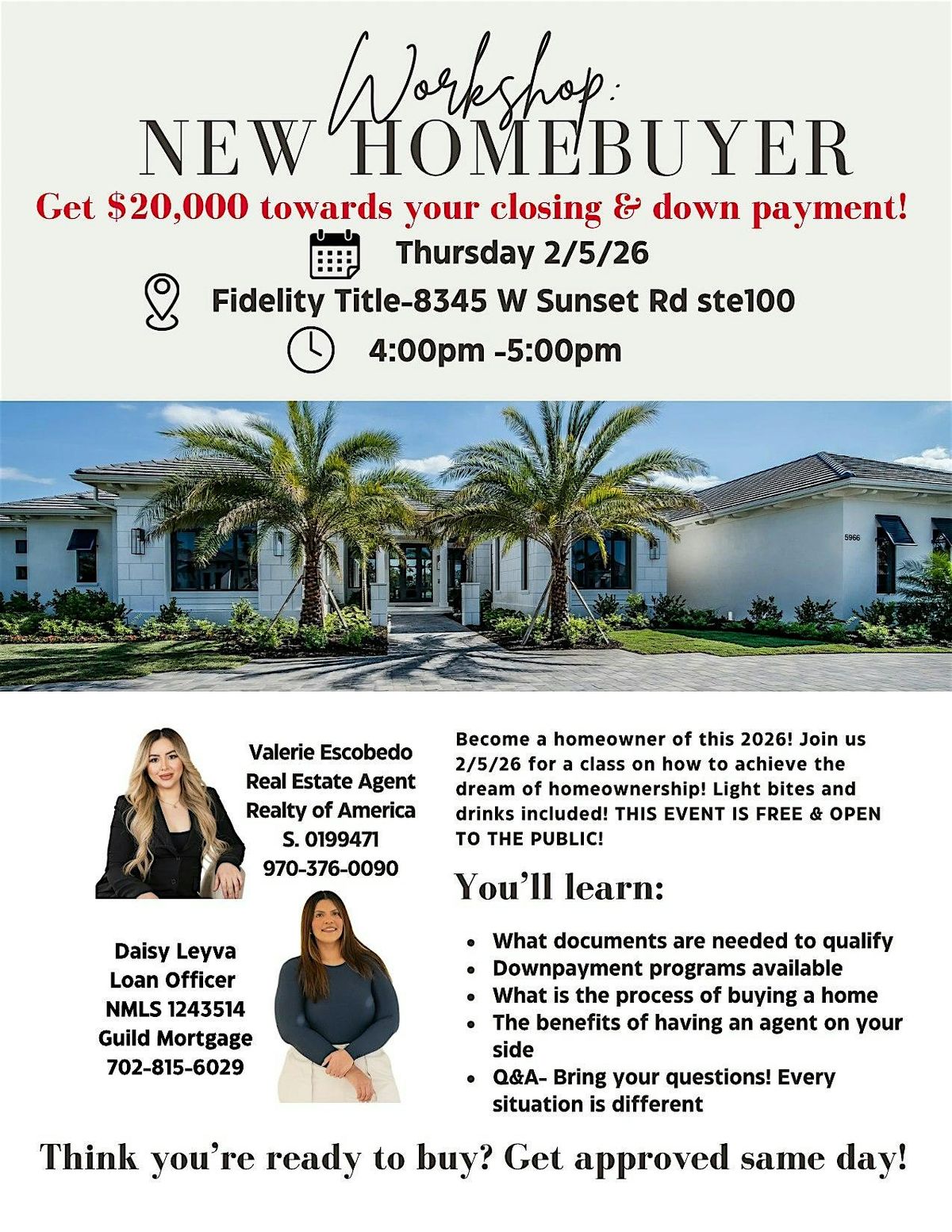 Join us for a FREE HOMEBUYER WORKSHOP designed to help you turn homeownership into reality! Learn how to qualify, explore down payment assistance programs (up to $20,000), understand the buying process, and get your questions answered by a local real estate agent and loan officer. Light bites and drinks included.