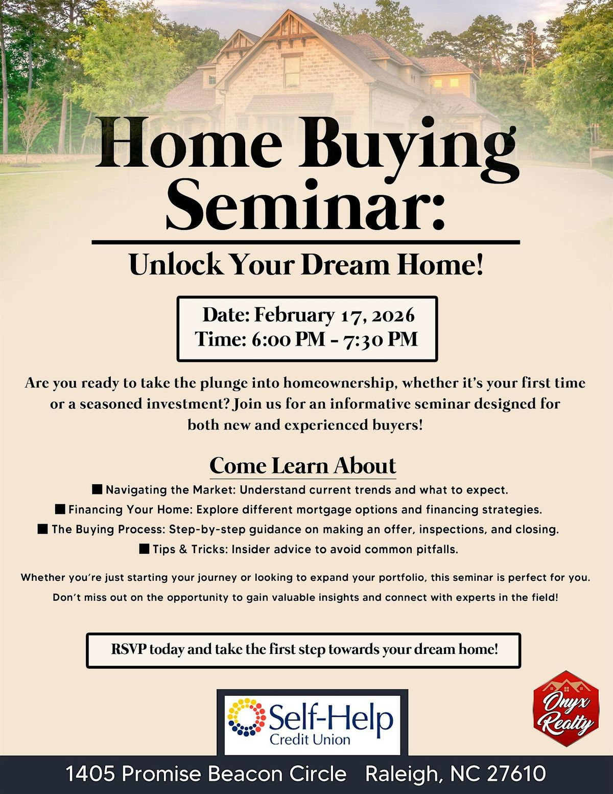 Join us for an informative home seminar hosted by Self-Help Credit Union and Onyx Realty, offering valuable insights, practical tips, and expert guidance on today’s housing topics. Whether you’re a first-time buyer or current homeowner, this session will help you make confident, informed decisions.