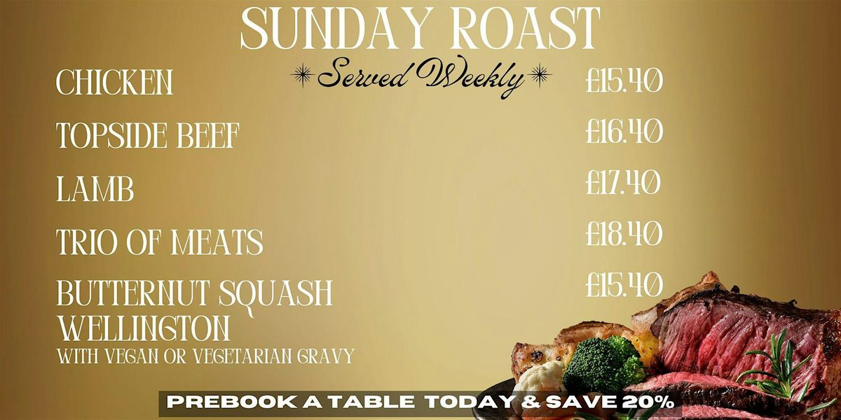 Step into comfort and tradition - Pre book your Sunday Roast now and save 20%