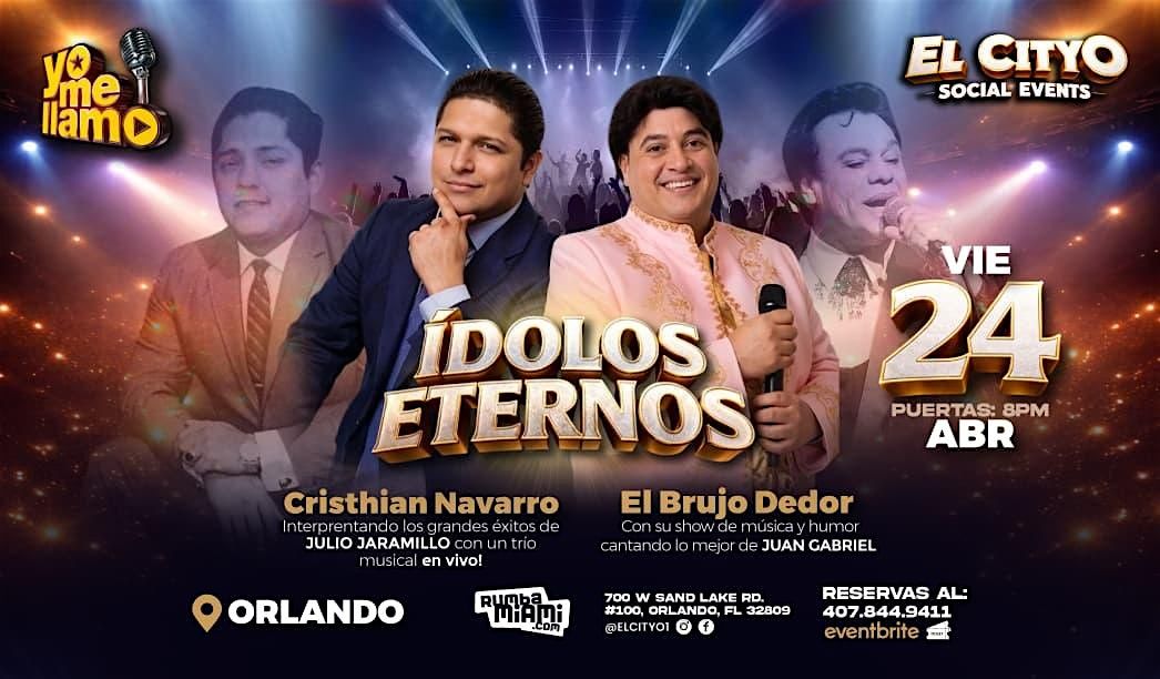 El Viernes, 24 de Abril, los éxitos y las voces de dos grandes ídolos de la canción, JULIO JARAMILLO con trío en vivo y de la voz de Cristhian Navarro (Yo Me LLamo Ecuador), junto al show de JUAN GABRIEL de El Brujo Dedor revivirán en El CityO de Orlando para una noche mágica llena de música, éxitos y un toque de humor!