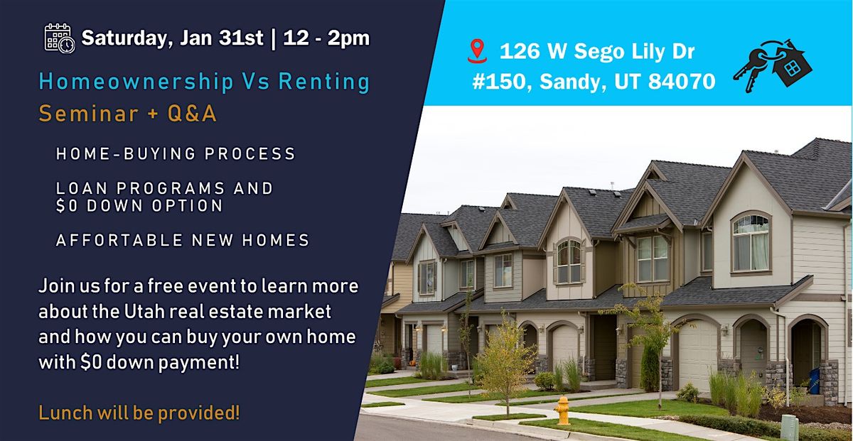 Join us for an informative and engaging Homeownership vs. Renting Seminar + Q&A, designed to help you understand your options and take confident steps toward homeownership in Utah. We’ll break down the home-buying process, explore loan programs—including $0 down payment options—and highlight affordable new home opportunities. Whether you’re currently renting, thinking about buying your first home, or just want clarity on today’s real estate market, this free event will give you practical insights, expert guidance, and the chance to ask questions in a relaxed setting. Plus, lunch will be provided!