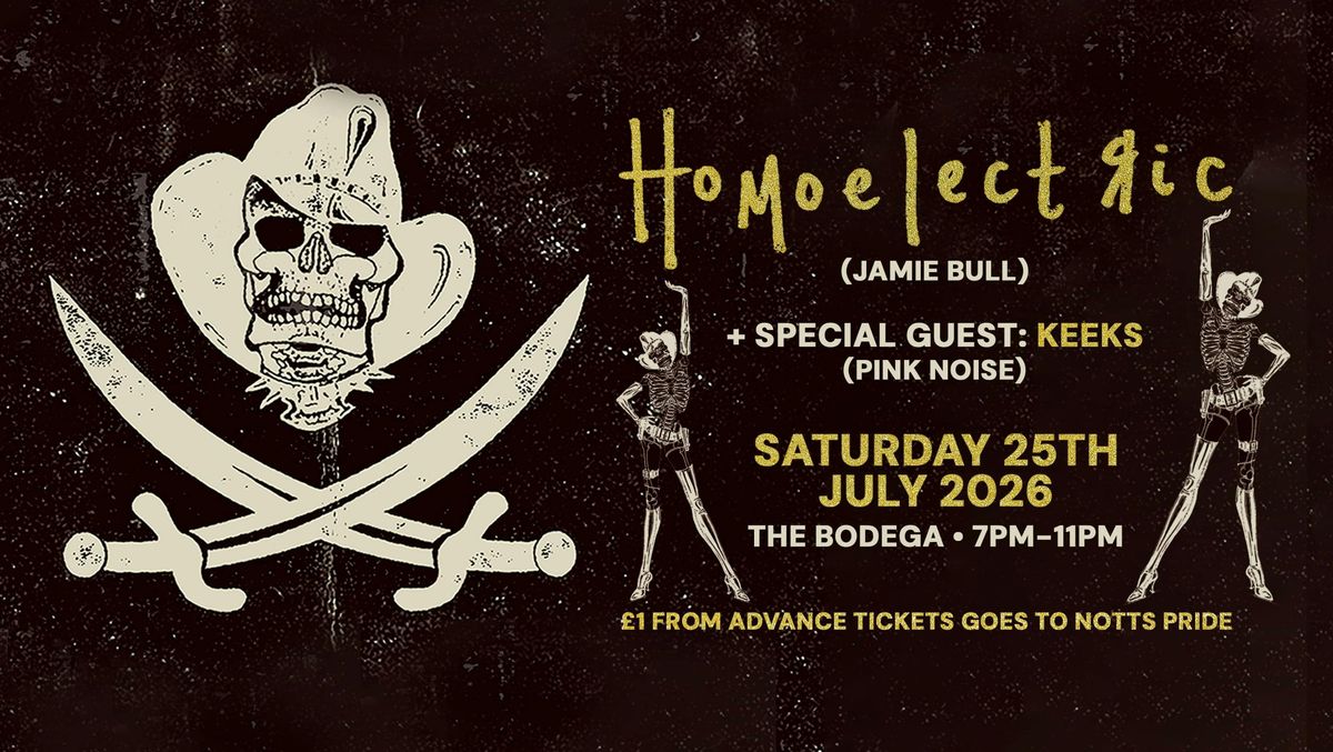 HOMOELECTRIC (Jamie Bull)+ Support: Keeks (Pink Noise)A non-stop off-piste dark discotek for homos, heteros, lesbos and don't knows. Into this place with no corners there is an alchemy from cosmic grooves, street soul, slo mo dance, boogie, black heart disco, US garage, house, technoid, outerspace sonic science, bassbuggin' rawness, odd numbers and vocals from heaven. We are homobloc. We are friends electric. We are the late night disenfranchised. No height restrictions.