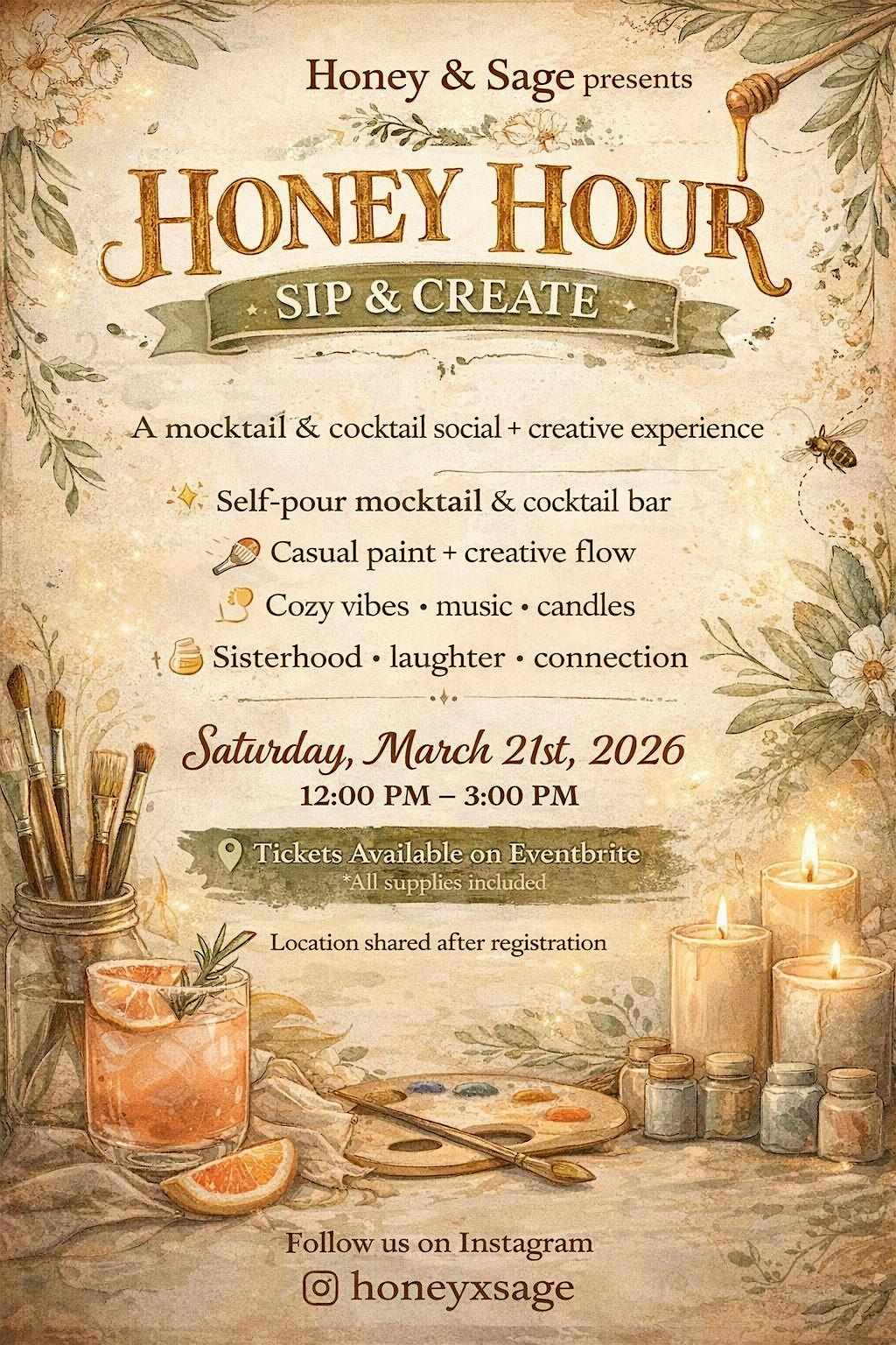 Honey Hour is a laid-back, intentional gathering for women to sip, create, and unwind together. This experience blends a self-pour mocktail & cocktail bar with a low-pressure creative moment, all wrapped in the cozy, inviting Honey & Sage vibe.
