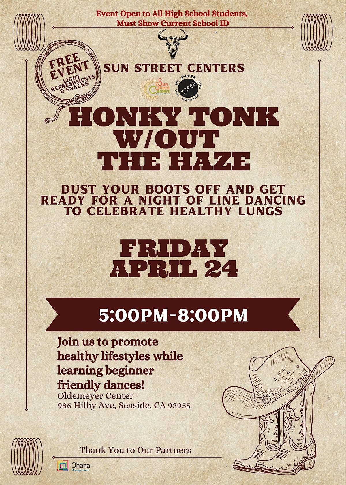 Attention high school students! Dust your boots off and get ready for a fun night at the Oldemeyer Center! Join us on April 24, 2026 at 5:00 PM (Pacific Time) for some great tunes and good vibes with Out The Haze. It’s the perfect chance to learn new information regarding healthy smoke-free lifestyles, enjoy music, and maybe even dance a little. Don’t miss out on this awesome in-person event!