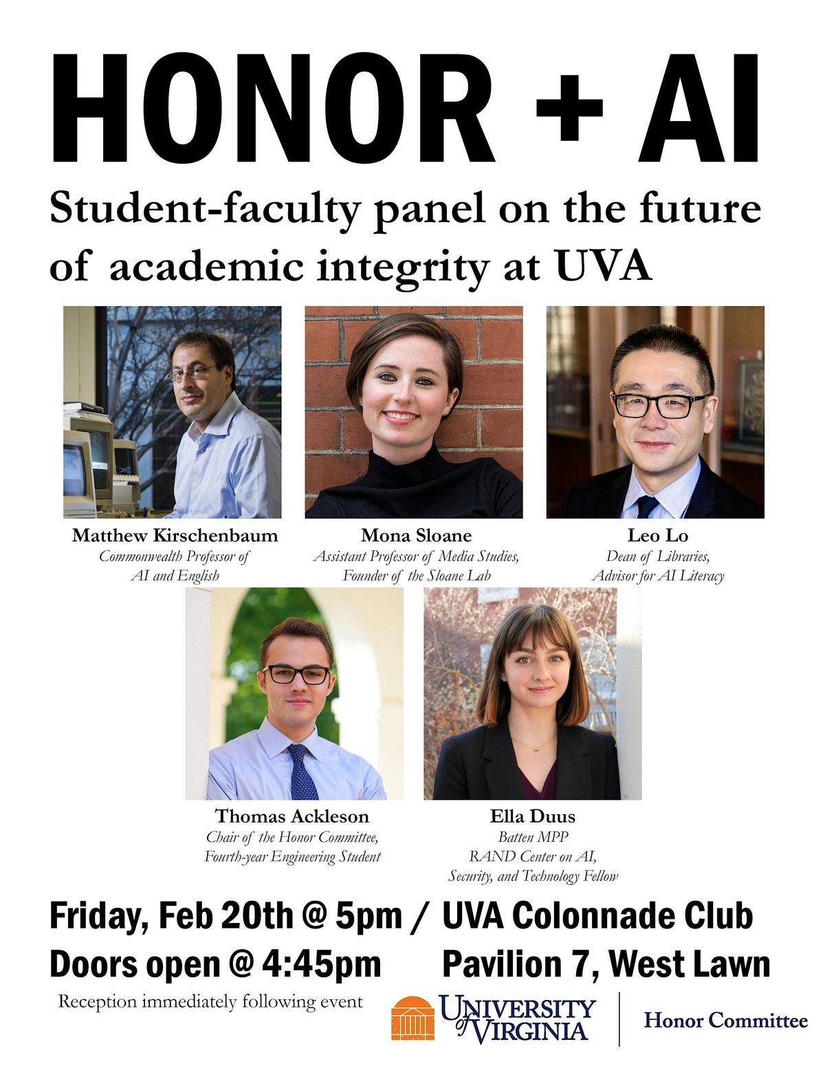 This is the final event for Honor Week 2026, focused on faculty and organized by the Faculty Advisory Committee of the Honor Committee. Attendance is limited to teaching faculty or instructional designers from any department or school at the University of Virginia. The panel of three faculty and two students will be introduced and asked a number of predetermined questions about the impact of artificial intelligence on classroom instruction and assessment, as well as the implications of AI for academic integrity. Then, the panel will field questions from the audience. Please join us after the panel for a catered reception on the first floor of the Colonnade Club.
