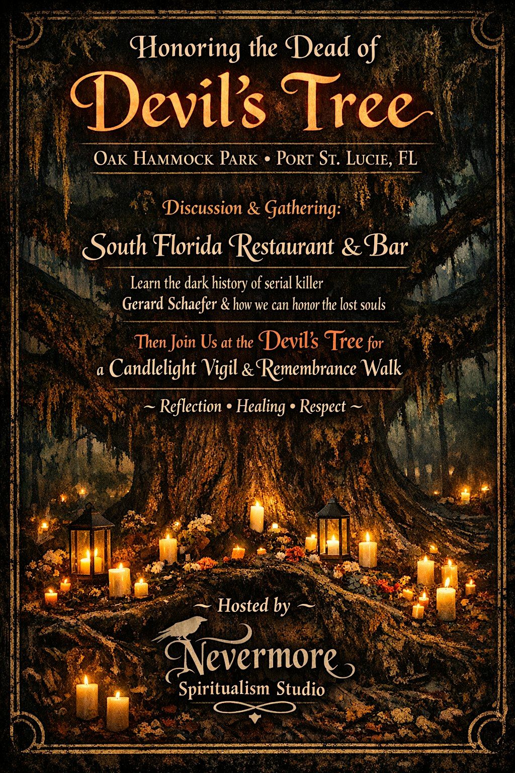 Join us for a reflective evening honoring the spirits connected to the infamous Devil’s Tree in Oak Hammock Park.
