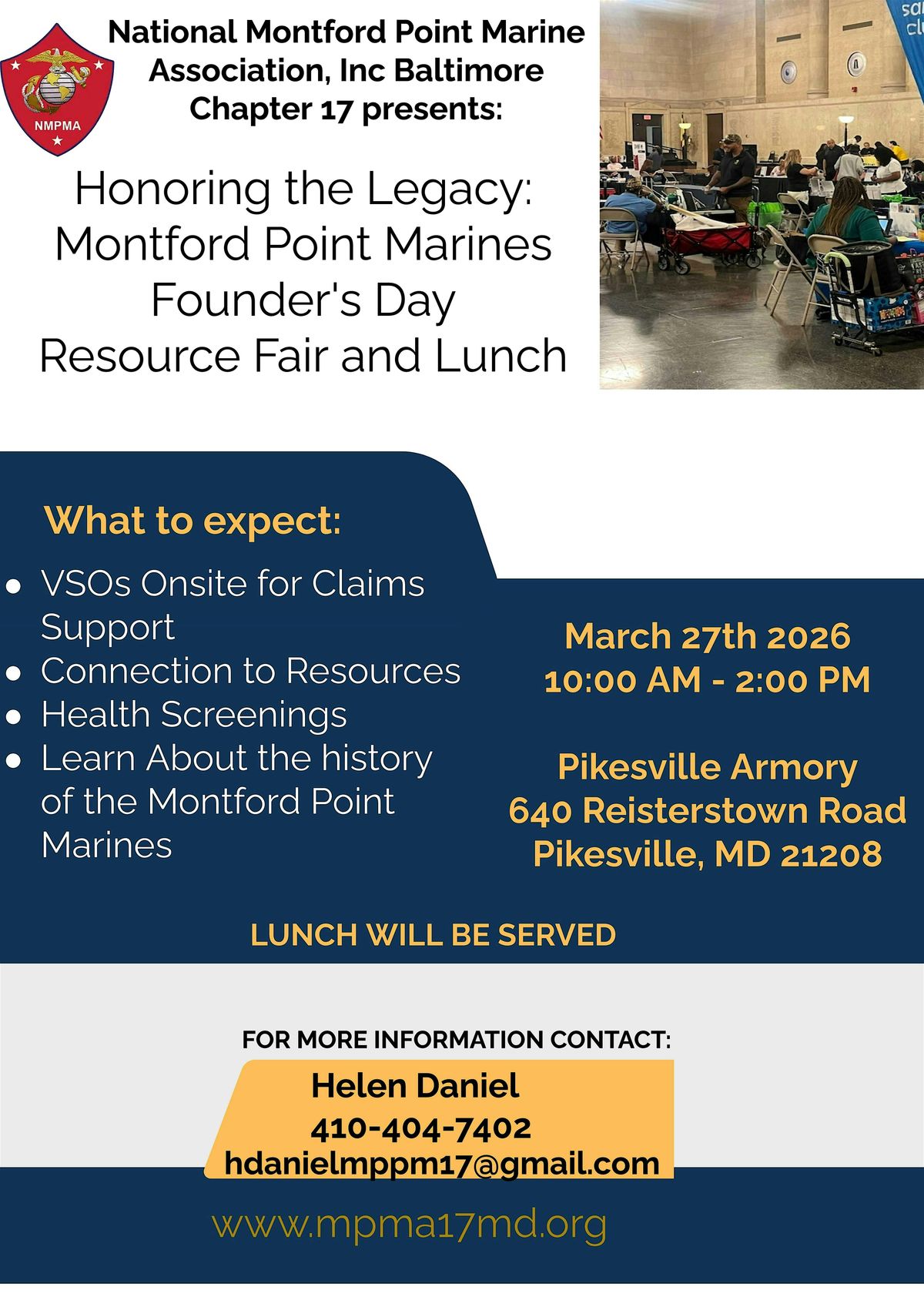 Welcome to the Honoring the Legacy: Montford Point Marines Founder's Day Resource Fair! Join us at Pikesville Armory Foundation on March 27, 2026 at 10:00 AM (Eastern Time) to celebrate and honor the incredible legacy of the Montford Point Marines. This event will feature a resource fair and claims clinic showcasing various organizations and services. Don't miss this opportunity to pay tribute to the first African Americans to serve in the United States Marine Corps. See you there!