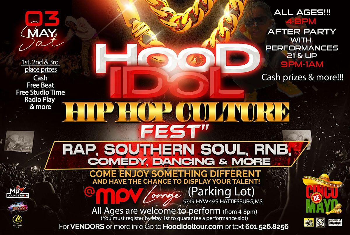 Welcome to the **Hood Idol Hip Hop Culture Fest**! Get ready for an epic day and night filled with amazing performances, great music, and non-stop dancing. Join us at MpV Lounge parking lot on **Sat May 03 2025** at **4pm-8pm** for an unforgettable experience.
