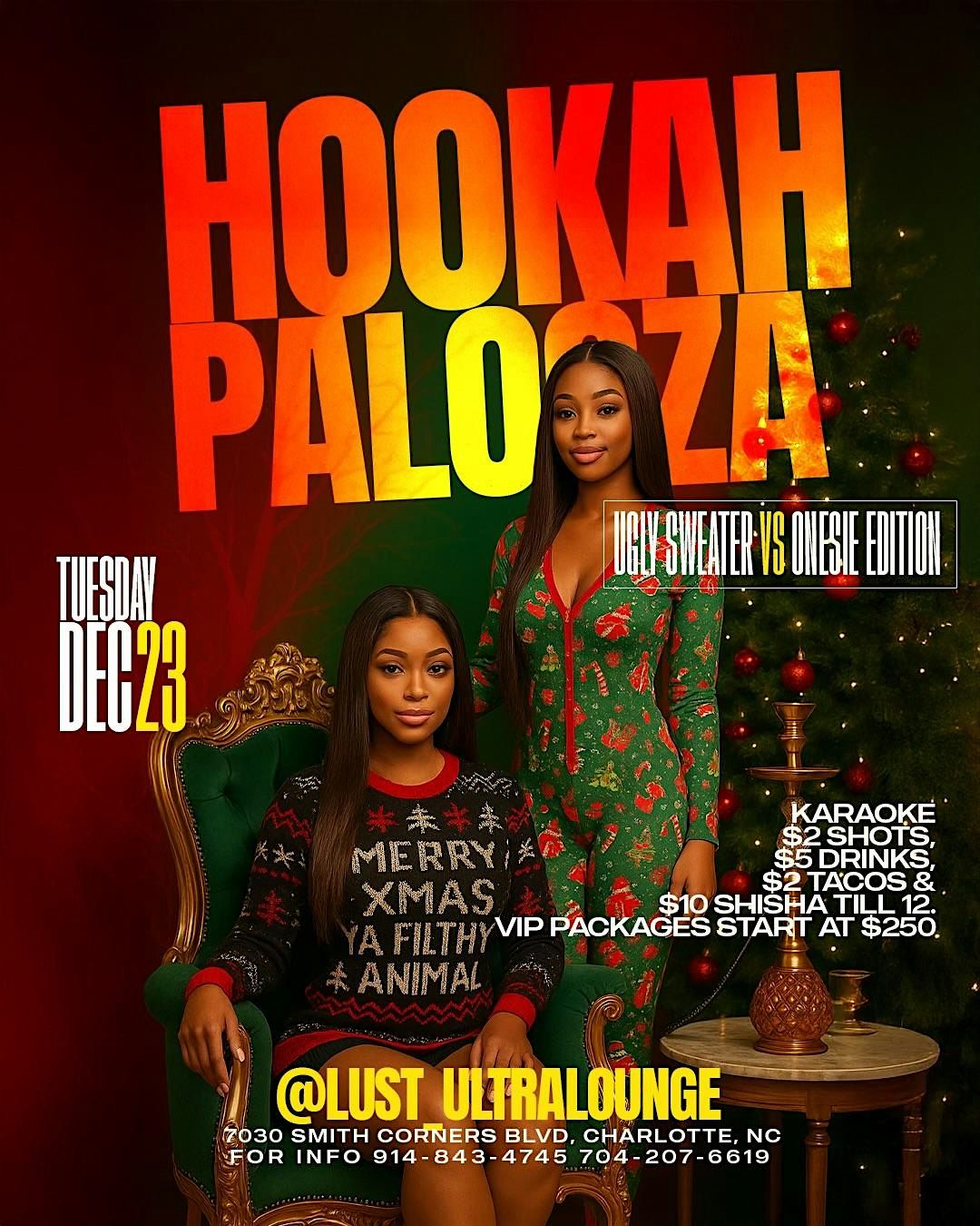 Lust Ultra Lounge presents Hookah Palooza, a special holiday edition featuring Ugly Sweaters vs Onesies. Enjoy a full night of karaoke, drink specials, tacos, shisha, and a festive crowd.
