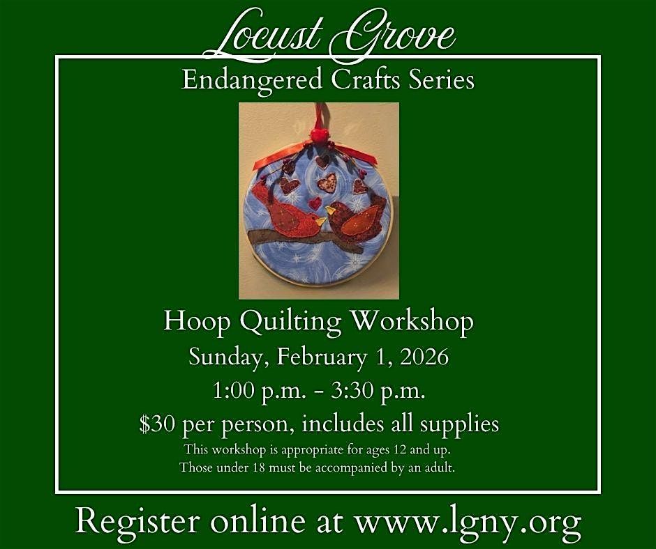 Locust Grove is kicking off their Endangered Crafts series with a Hoop Quilting workshop. Join us for a fun afternoon of crafting, and view quilted items from our collection.