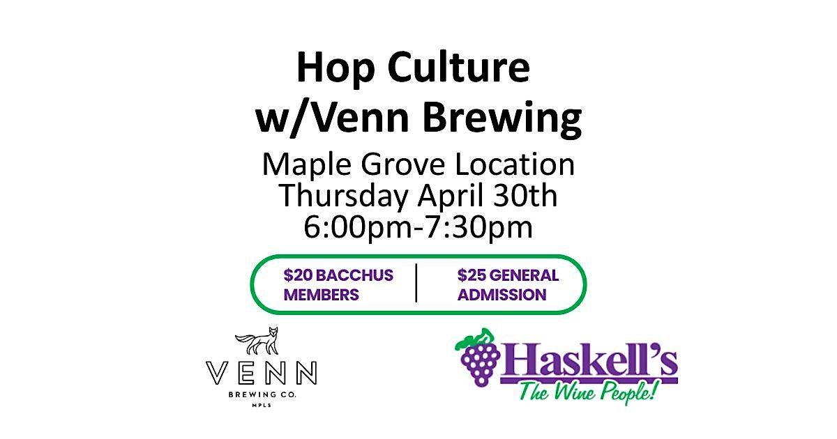 Join us in Maple Grove as we tap into something new with Hop Culture, our monthly tasting series celebrating great beer and some local flavor! Each event features a fresh lineup of brews that might be brand new to you, delightfully unique, or simply perfect for satisfying your love of hops and barley. Kicking things off on April 30, our very own local suds hoperator, and employee of over 10 years, Deren Argir will be pouring a full lineup from Venn Brewing of Minneapolis. Tickets are $20 for Bacchus members and $25 for non‑members, with small bites included to snack, sip, and cleanse your palate along the way. Come thirsty, come curious—we hope to see you there!