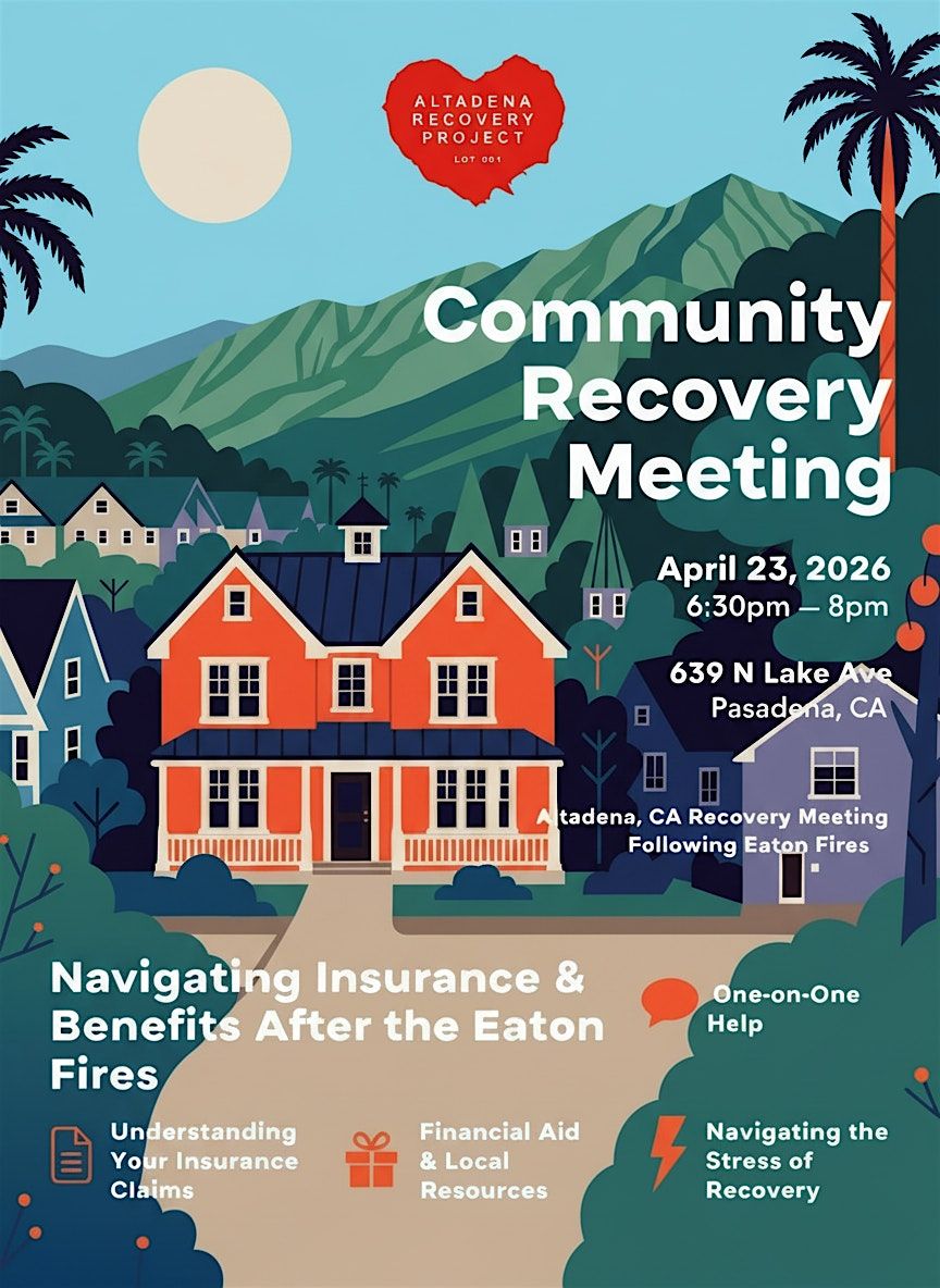 Join us for the Altadena Community Recovery Meeting, a dedicated space for residents navigating the real challenges of rebuilding after the Eaton Fires. Whether you’re just starting your claim or already deep in the process, this meeting is designed to address the actual issues people are facing right now—delays, underpayments, confusing policy language, and back-and-forth with insurance adjusters.