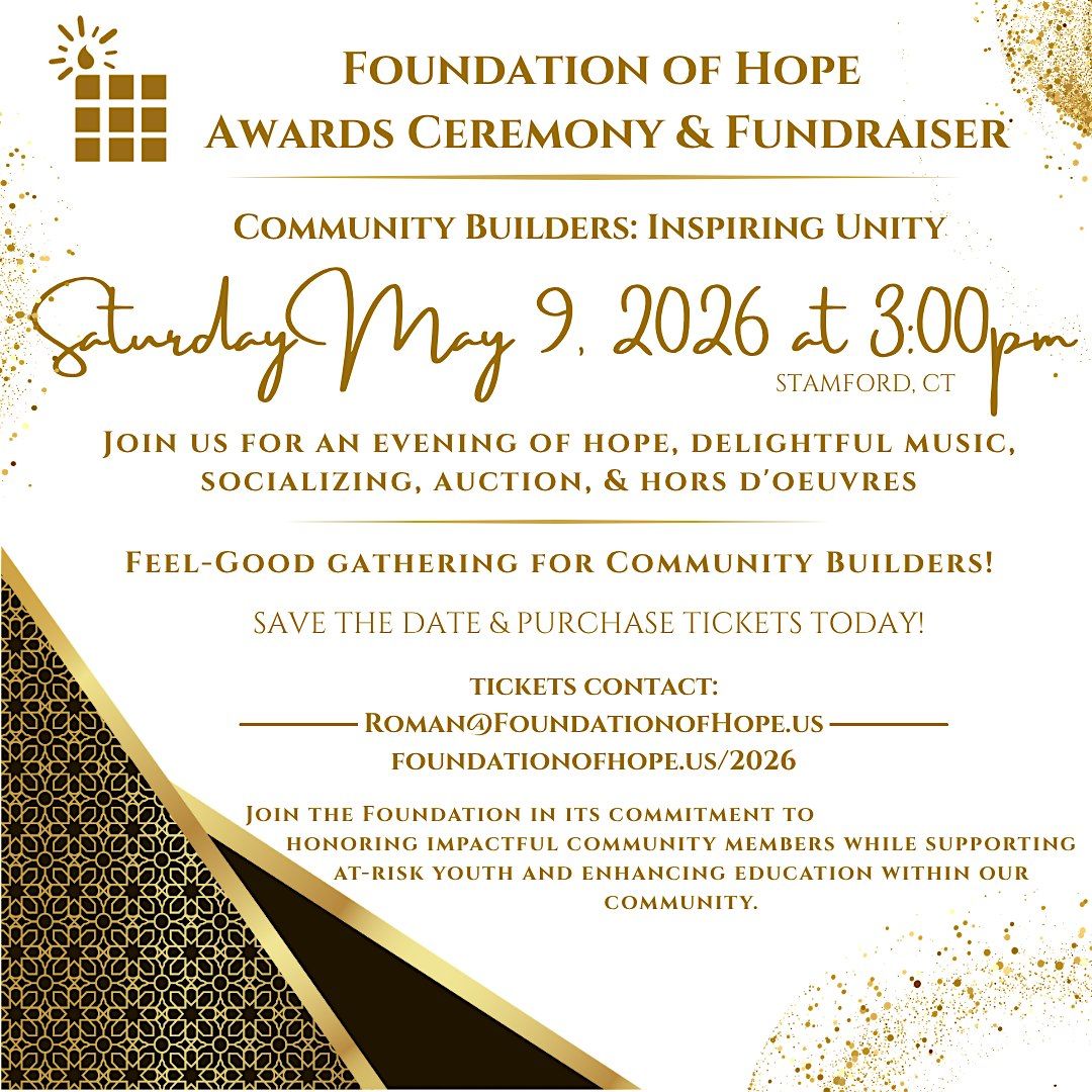 The Foundation of Hope Charity Celebration takes place Saturday, May 9, 2026, beginning at 3:00 p.m. and hosted at 1 University Place Stamford, CT. We warmly invite you to attend this special event and be part of an inspiring afternoon dedicated to supporting programs that uplift the most vulnerable members of our community.