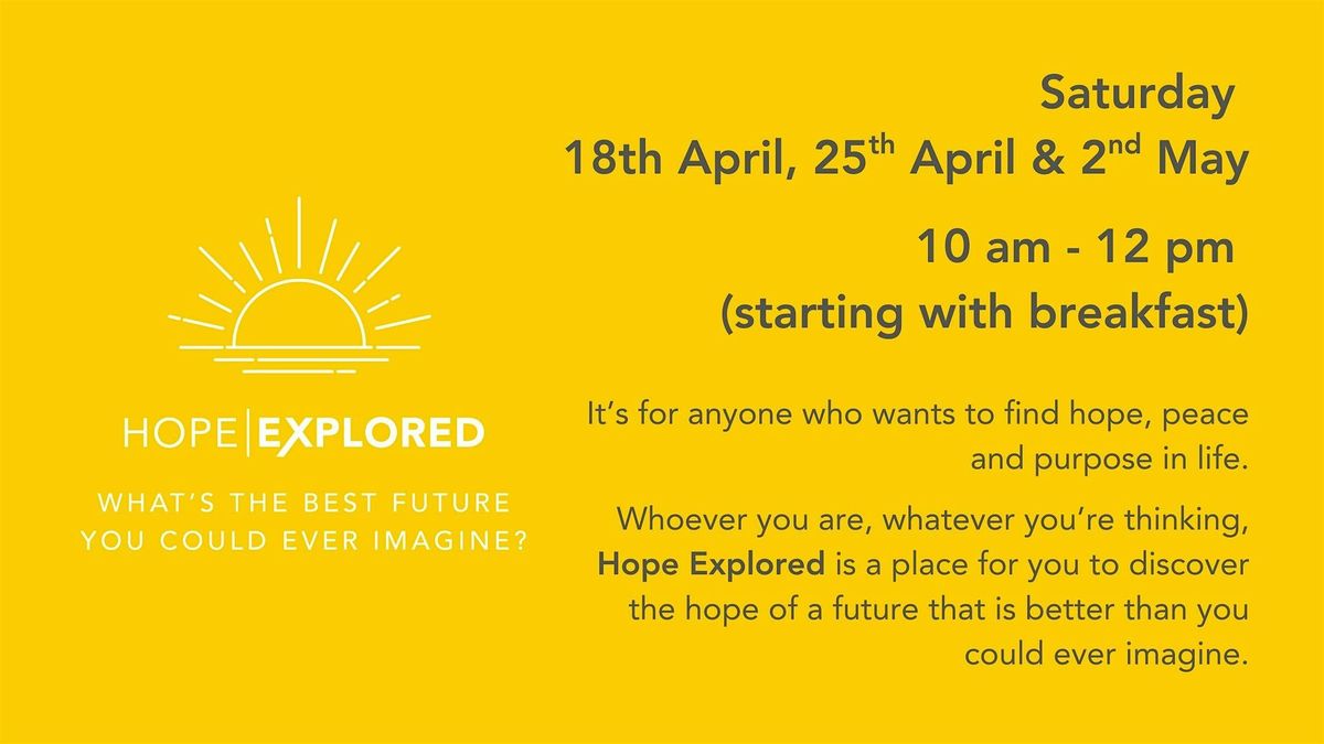 You are warmly invited to Hope Explored taking place in Crescent Church, Belfast on three Saturday mornings - 18th April, 25th April & 2nd May from 10am to 12noon. Hope Explored presents the life, death and resurrection of Jesus and provides an opportunity to discover how He fulfils the three longings we all experience: the longing for hope, peace and purpose.
