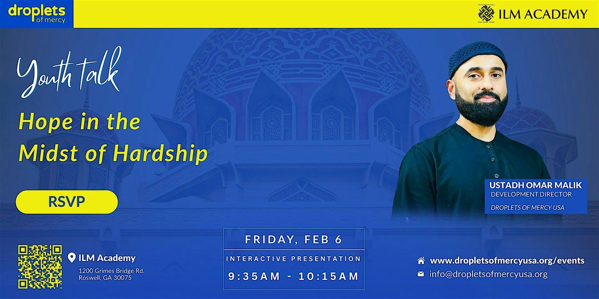 Welcome to Hope in the Midst of Hardship with Ust. Omar Malik at ILM Academy! Join us on February 6, 2026 at 9:30 AM (Eastern Time) for an inspiring, interactive workshop event. Let's come together to find hope during challenging times. Ust. Omar Malik will share wisdom and guidance to help us navigate life's difficulties. Don't miss this opportunity to uplift your spirits and connect with others.