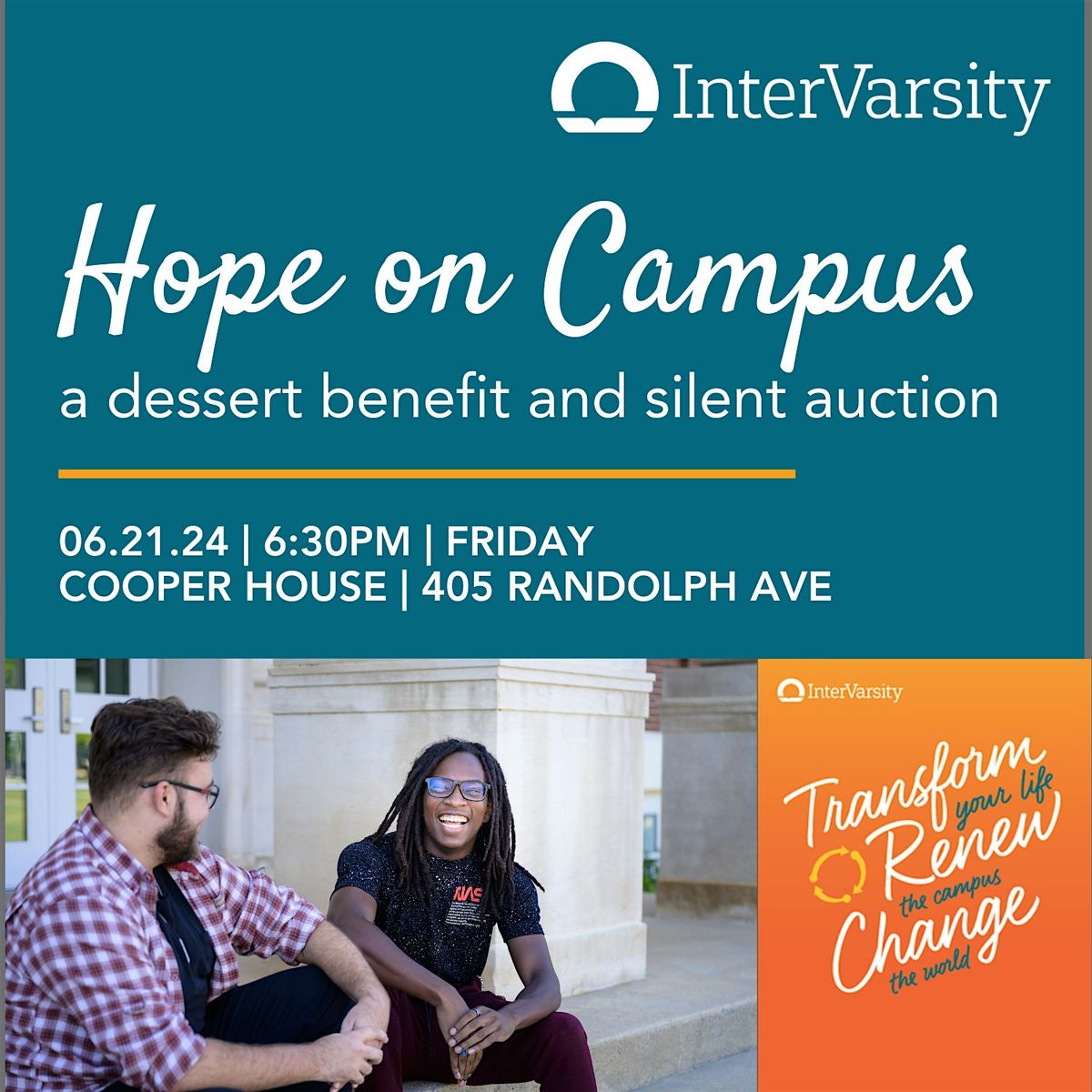 Welcome to Hope on Campus: InterVarsity Dessert Benefit and Silent Auction! Join us for an evening of sweet delights and inspiring stories at our fundraising dessert event in support of InterVarsity's campus ministry! You'll have the opportunity to bid on exciting items in our silent auction, enjoy delectable desserts, and hear firsthand accounts of the impact our ministry is making in the lives of students. Meet our dedicated student leaders and staff, and gain valuable insights during a brief training on sharing the gospel.
