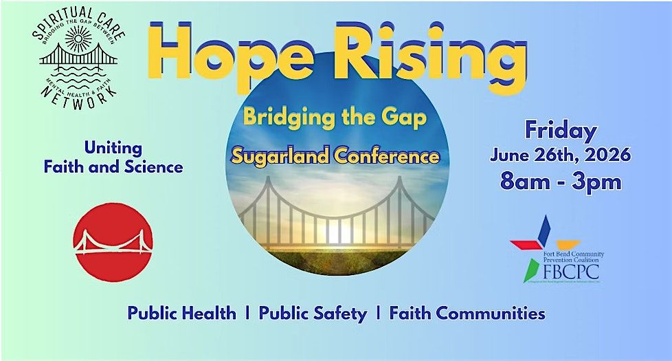 The Hope Rising: Bridging the Gap Sugarland Conference is a collaboration between the Spiritual Care Network and Fort Bend Regional Council. The community event is open to family members, mental health professionals, faith leaders, and anyone interested in mental wellness.