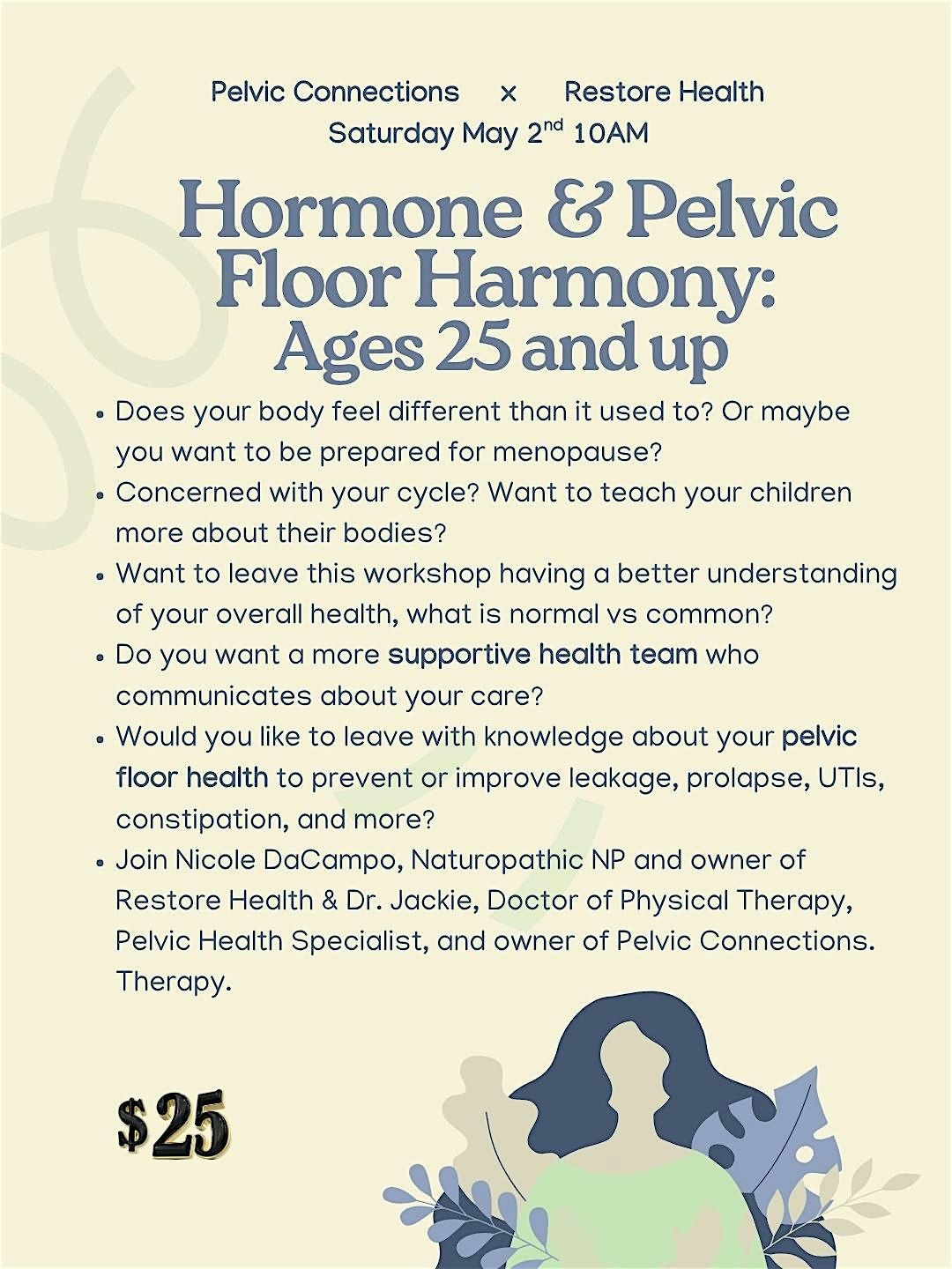 Join Nicole DaCampo, Naturopathic NP and owner of Restore Health & Dr. Jackie, Doctor of Physical Therapy, Pelvic Health Specialist, and owner of Pelvic Connections. Therapy for this incredible workshop! We are limiting the capacity to 10 individuals to keep our group small and intimate. This will be an interactive and educational workshop with a Q&A style portion. We can't wait to meet you!