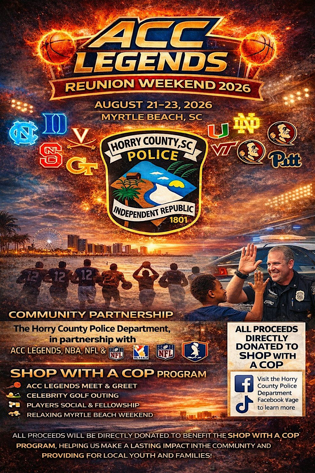 ⛳️ Celebrity Golf Event & Community Weekend📅 August 21–23, 2026📍 Myrtle Beach🎉 ABOUT THE EVENTCome join us for an unforgettable weekend at the ACC Legends Reunion Weekend Golf Event!We’re bringing together ACC Legends, fans, families, and the community for a powerful weekend filled with fun, fellowship, and giving back. This is more than just a golf event — it’s a full experience.❤️ GIVING BACKThis year, we are proud to partner with the Horry County Police Department to support their Shop With a Cop Program — helping provide opportunities and support for local children and families in the community.All proceeds will go toward making a lasting impact.🎯 WEEKEND HIGHLIGHTS⛳️ Celebrity Golf TournamentPlay alongside ACC Legends and enjoy a day on the course.🤝 Meet & GreetConnect with former ACC players and special guests.📸 Autographs & PhotosCapture memories with some of your favorite legends.🎁 Silent AuctionBid on exclusive items and experiences.🌊 Beach PartyRelax and enjoy the Myrtle Beach atmosphere.🍽️ Food & BeveragesGreat food, drinks, and hospitality all weekend long.🔥 WHY YOU DON’T WANT TO MISS THISHang out with ACC LegendsEnjoy a full weekend of activitiesNetwork, relax, and have funSupport a meaningful cause🎟️ GET INVOLVEDWhether you’re playing, sponsoring, or just coming to enjoy the weekend — there’s something for everyone.🔥 CALL TO ACTIONGrab your clubs, bring your family, and come be a part of something special!Let’s have an amazing time while making a difference in the community.