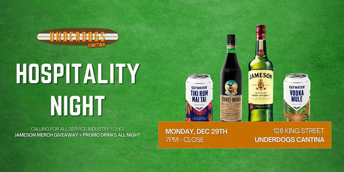 Join us at Underdogs Cantina for a dedicated Hospitality (Service Industry) Night featuring exclusive Jameson merch giveaways and drink promos all night long.