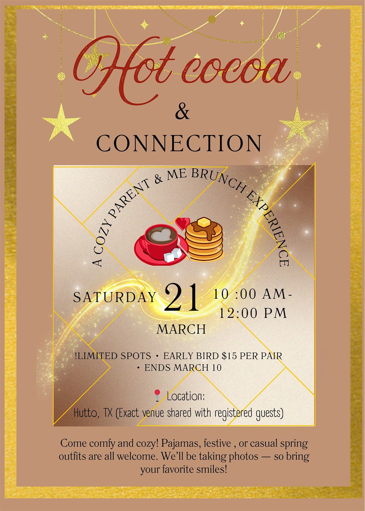 Warm cocoa, fluffy pancakes, and sweet memories await Join us for a beautiful Parent & Me Hot Cocoa Brunch — a cozy spring morning.About this Event