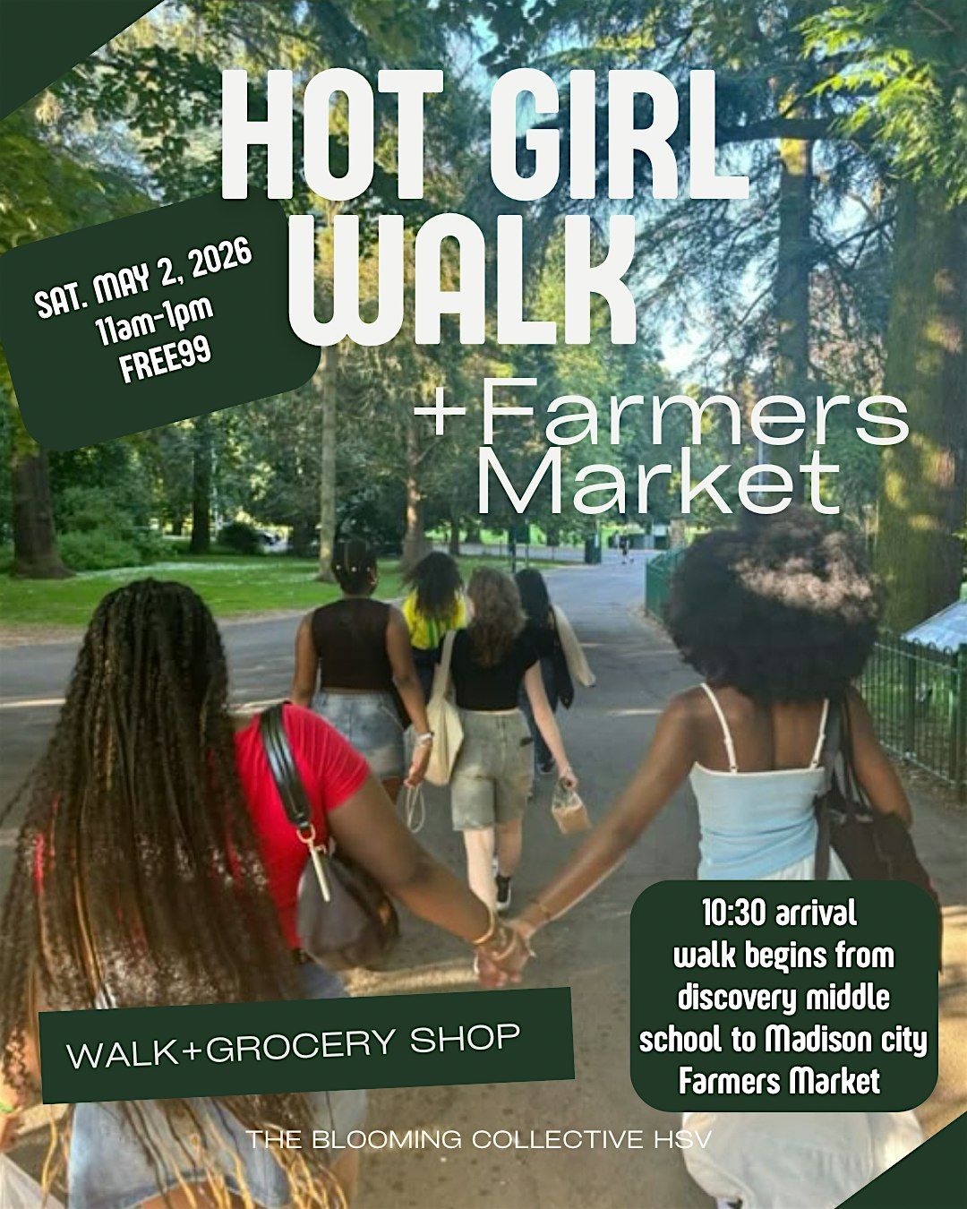 We will arrive in the football parking lot of Discovery Middle School at 10:30AM and group to begin our walk toward the farmers market at prompty 11:00AM.