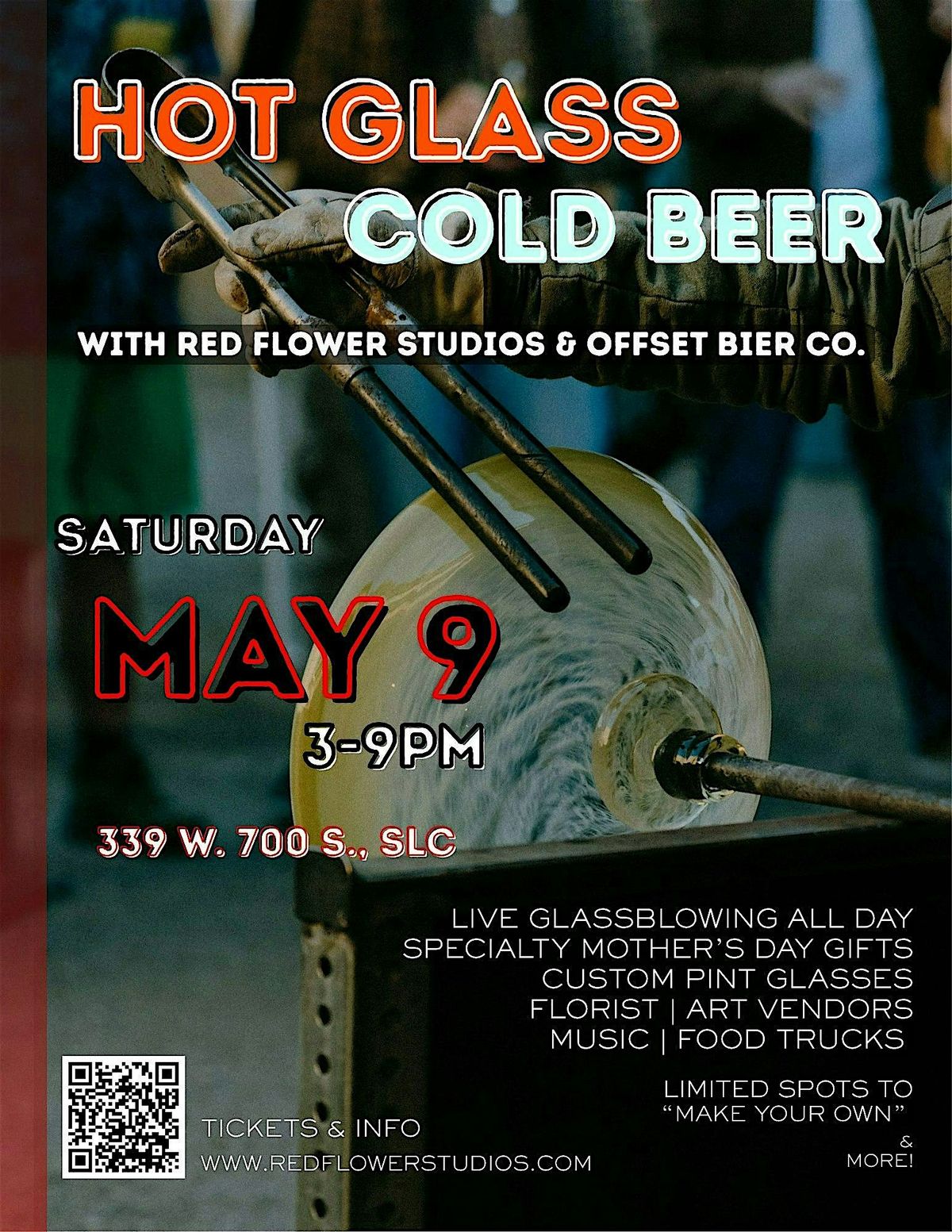 - Glassblowing slots are very limited. Purchase a Make Your Own Vase ticket to guarantee your spot. Only available at www.redflowerstudios.com/hotglasscoldbeer