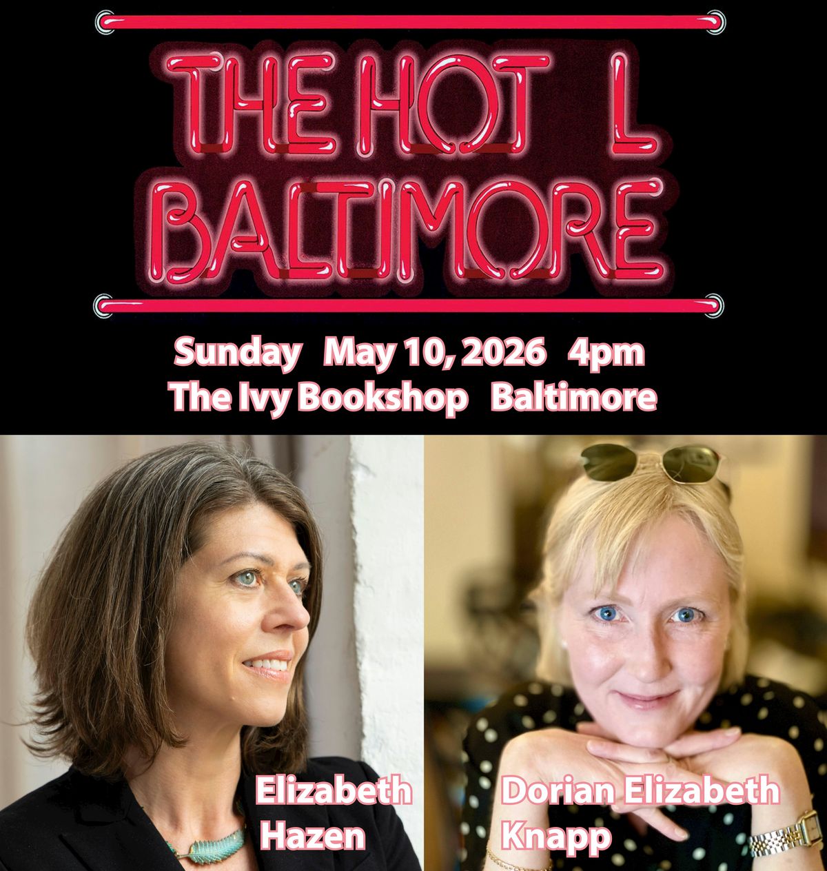 Sunday May 10, 2026 at 4pm, The HOT L Poets Series continues at The Ivy Bookshop (Baltimore) with poets Elizabeth Hazen & Dorian Elizabeth Knapp! The reading includes an open mic so bring a poem (1 poem, 3 min. or less).